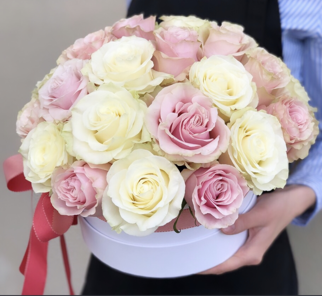 Состав: Роза белая (10), роза розовая (15), Коробка цилиндр (1), оазис